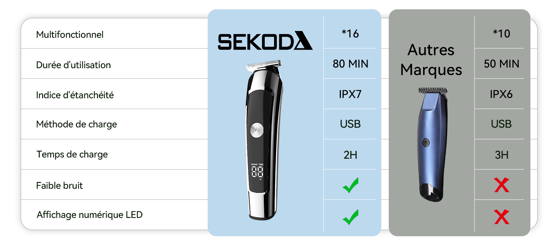 Dites adieu aux accrochages et aux tiraillements ! La tondeuse Sekoda est équipée d'un moteur puissant et performant qui délivre une puissance forte et constante. Que vous ayez des cheveux doux et fins ou des cheveux épais et rêches, elle gère tout avec facilité, offrant une coupe nette et précise à chaque fois.
